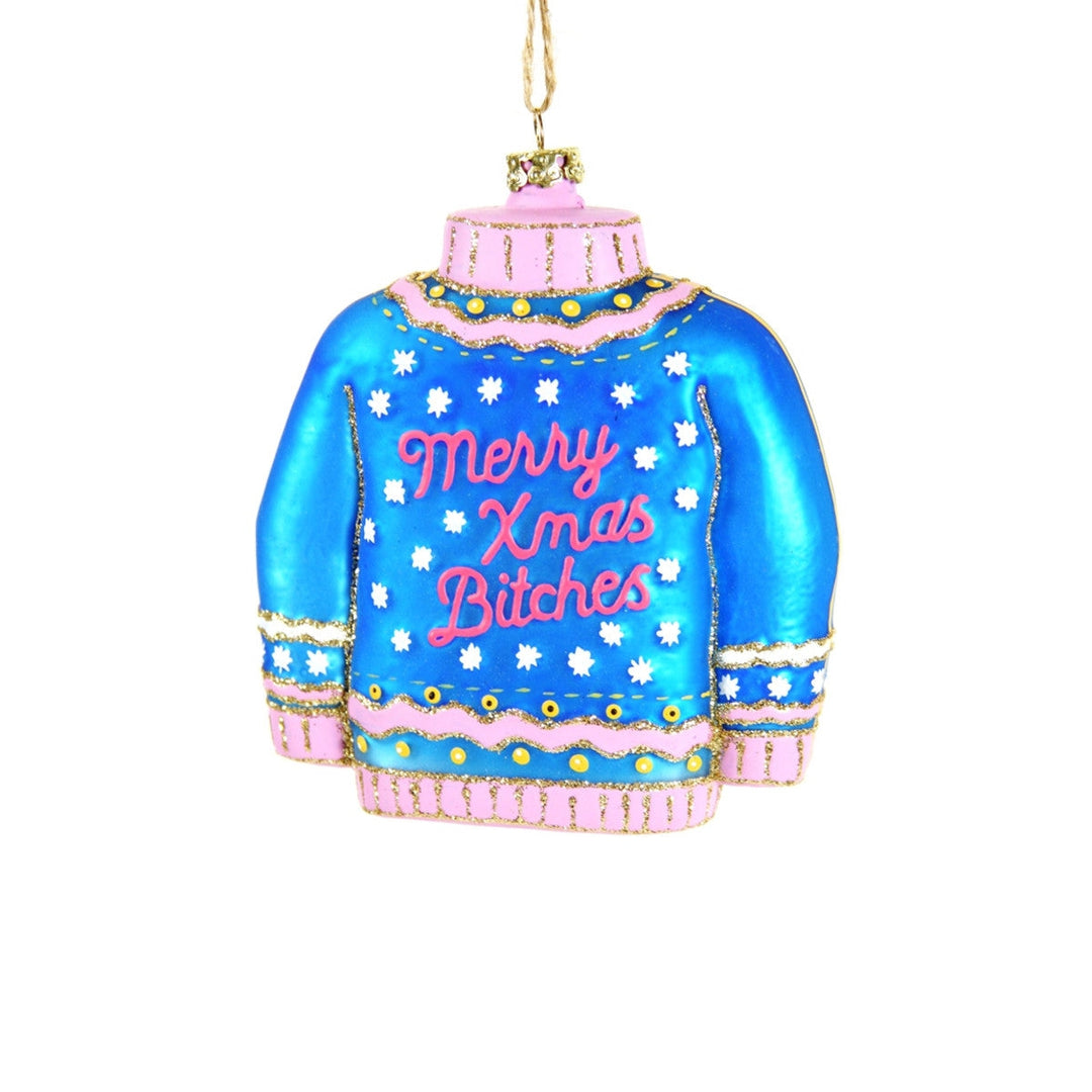 Merry Xmas B*tches Ugly Sweater Glass Ornament - Blue