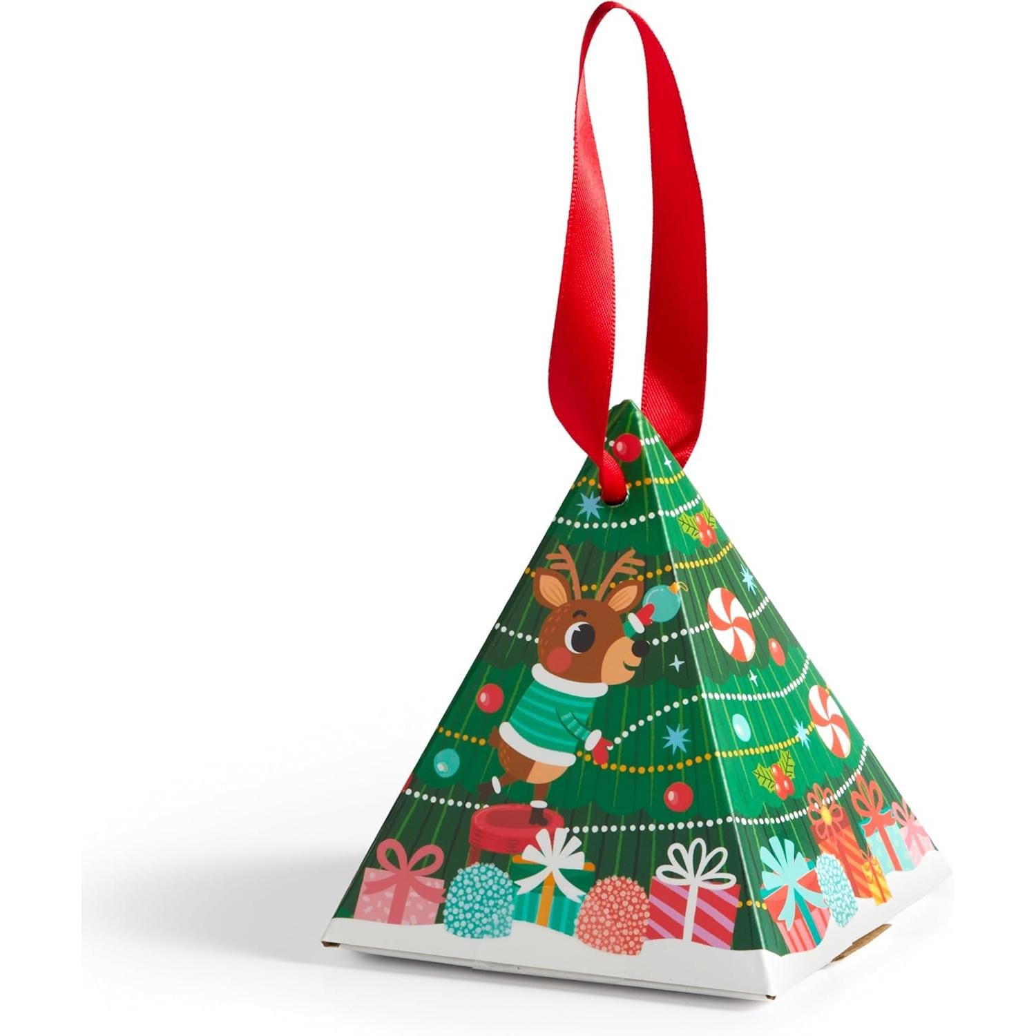 PUZZLE ORNAMENT – The Reindeer Snow Globe 48 Piece Puzzle Ornament features a colorful illustration with reindeers decorating their tree inside a snow globe. The box includes a tag with the full puzzle image for reference. The puzzle pieces are boxed in a charming tree-shaped ornament with attached red ribbon for easy hanging and an insert inside featuring the full puzzle image. It makes a perfect holiday gift!