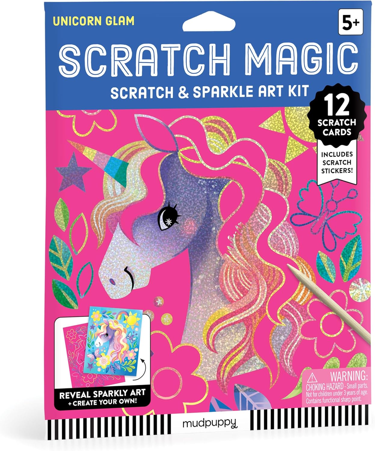 SCRATCH & SPARKLE – Scratch to reveal sparkly art work with Mudpuppy's Unicorn Magic Scratch & Sparkle Kit! The kit features 12 fun illustrations of unicorn themed scenery so kids will have fun as they scratch and uncover the sparkly unicorns and rainbows underneath. The kit comes with easy to follow directions as well as a wooden drawing tool to get started! It also comes with 3 "Design your own" sheets so you can create and reveal your own sparkle artwork!
