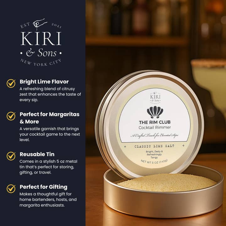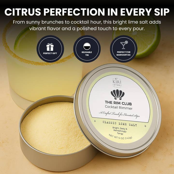 Elevate your cocktails with Kiri & Sons Chili Lime Margarita Salt Cocktail Rimmer, a bold spicy salt mix that combines zesty citrus with a fiery kick. This handcrafted chili lime salt enhances drinks with vibrant flavor and a gourmet finish, making it the perfect drink garnish for home or professional use. Packaged in a sleek, reusable 5oz cocktail salt tin, it fits standard margarita glass rimmer sizes for easy application. Use this versatile rim salt for cocktails to upgrade both classic and custom creations with balanced spice and tang. Ideal for parties, events, or everyday entertaining, this cocktail rim seasoning is a must-have addition to any drink salt blend or cocktail accessories collection. It also makes a thoughtful gift for cocktail lovers and bartenders.