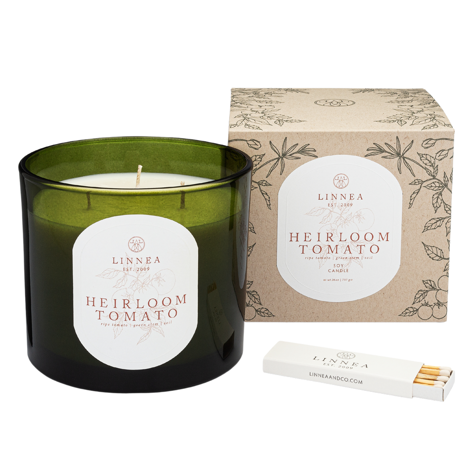 The newest addition to the Heirloom Tomato Collection, the grand three wick candle captures the essence of a sun-drenched summer garden. Hand-poured in a moss green glass vessel, it blends ripe tomato, green stems, and soil, evoking the fresh, earthy aroma of heirloom tomatoes straight from the vine. A perfect way to bring the outdoors in.