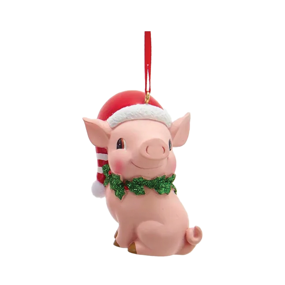 Pink Pig With Santa Hat Ornament - Sitting
