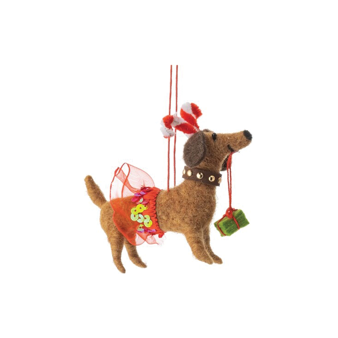 Brown Dachshunds With Presents Felt Ornament - Red Tutu