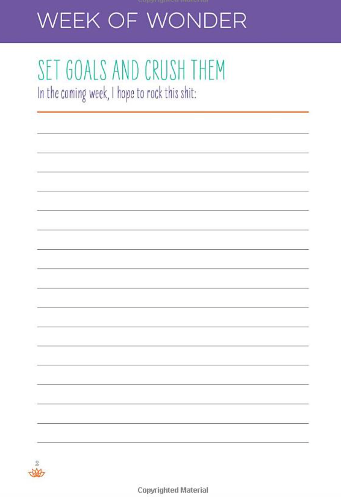At the beginning of each week, set those goals and plan how to crush them. Keep track of your tasks, give yourself some mood-boosting reassurance, and let go of the sh*t that grinds you down. When the week comes to a close, you’ll have space to take stock of everything that went well. Keep up your motivation and feel f*cking amazing as you move through the days and weeks of this book.