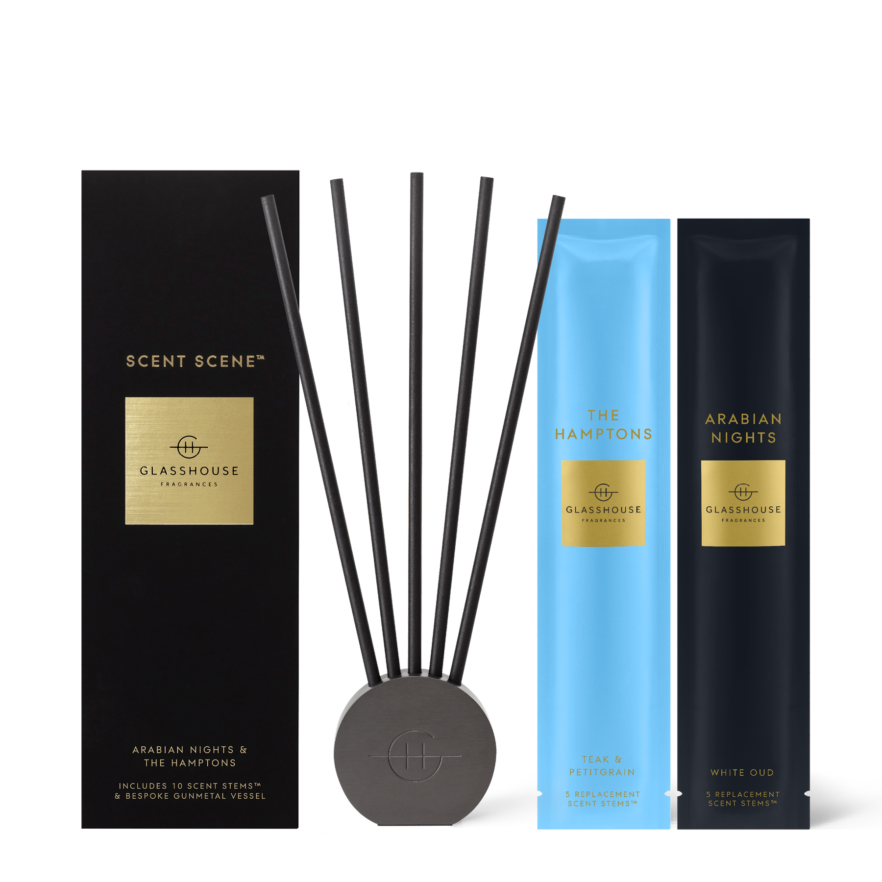 The Scent Scene™ Duo includes two individually packaged Scent Stems™ fragrances: The Hamptons Teak & Petitgrain & Arabian Nights White Oud. To use place your Scent Stems™ of choice into the metal vessel, ensuring it's placed on a flat surface away from open windows or vents. After 30 days, or a time of your choosing, swap out the Scent Stems™ for the other supplied fragrance.